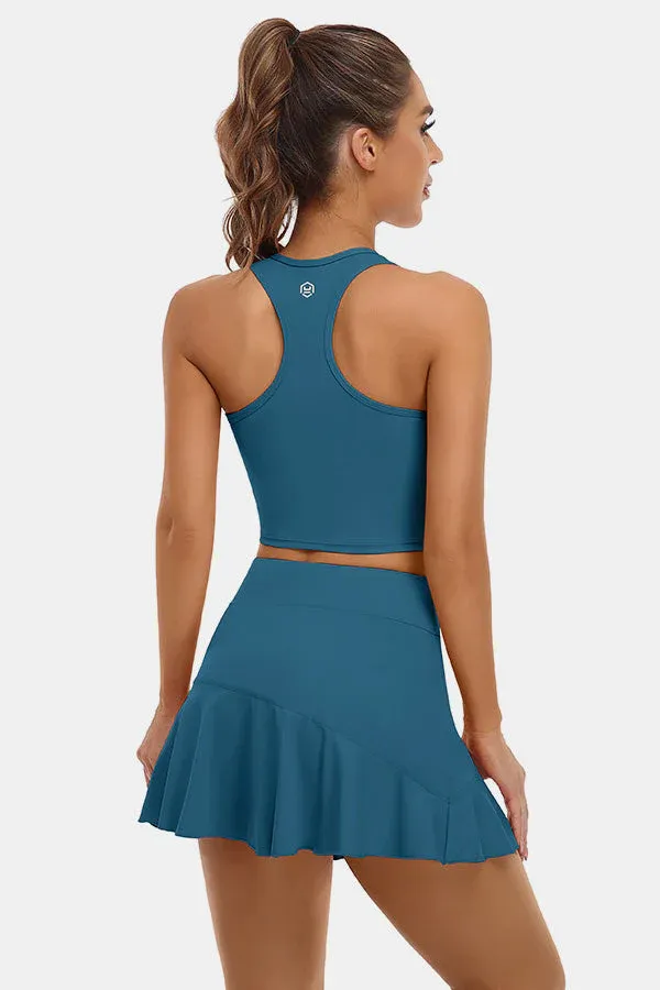 Women’s tennis skirts with racerback crop tops feature breathable, moisture-wicking fabric to ensure all-day active comfort.
