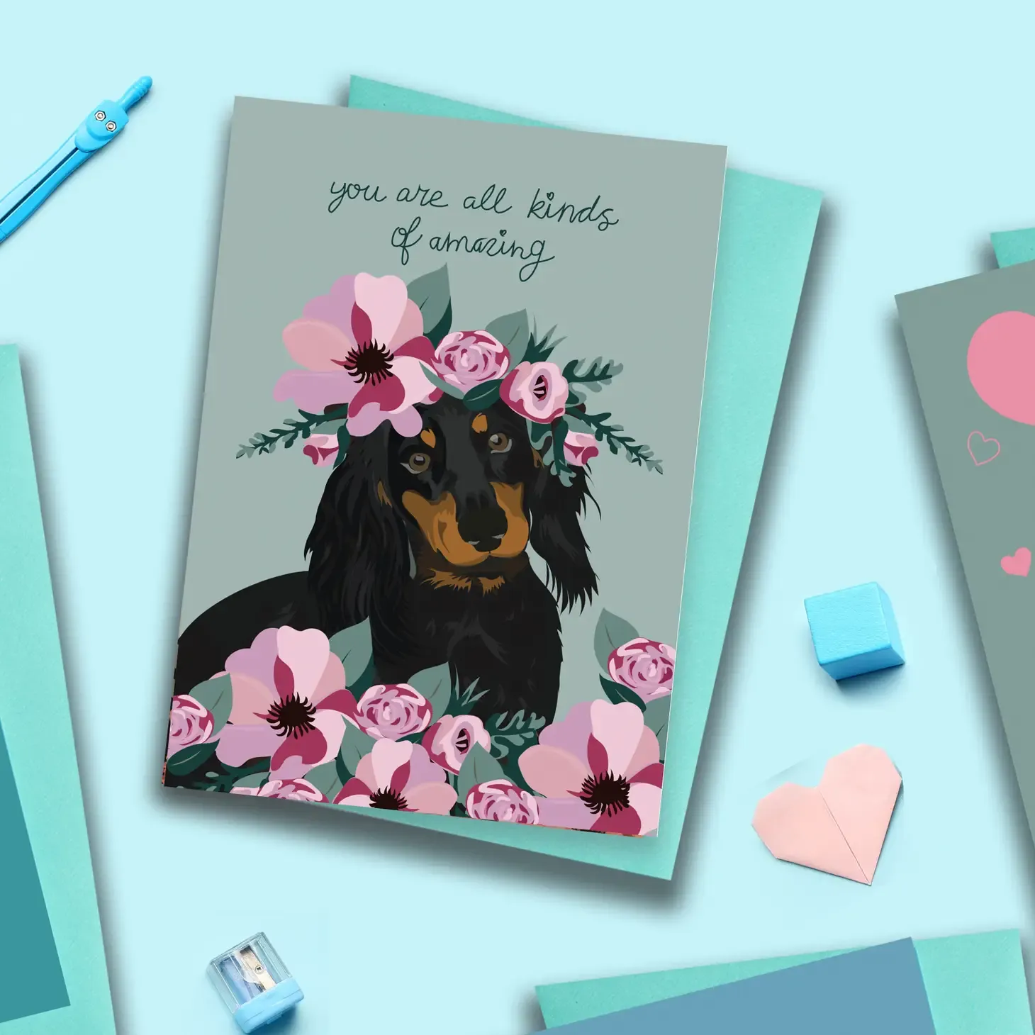 You are all kinds of amazing sausage dog illustration with Dachshund wearing a flower crown. This cute dachshund wearing a flower crown card is perfect for a celebration!